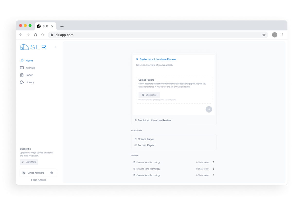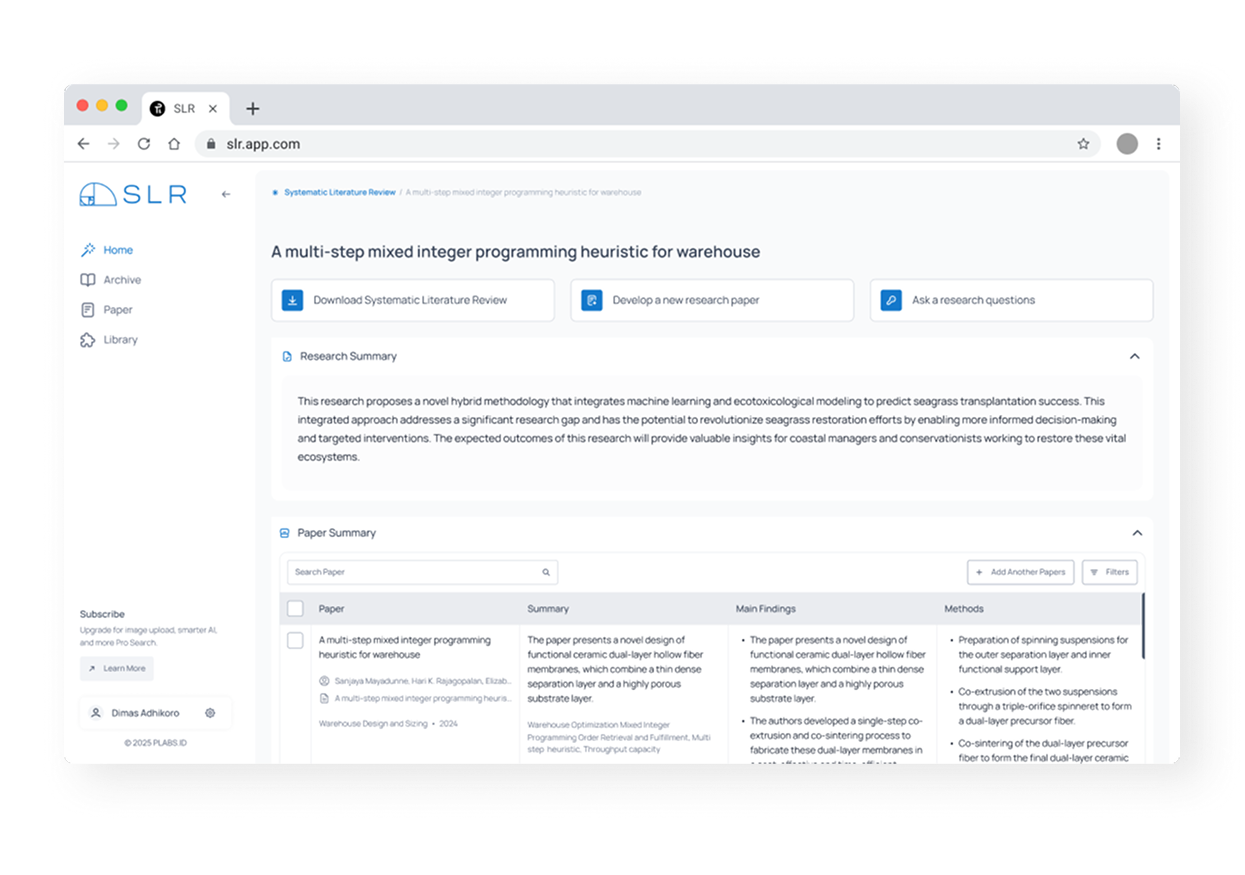 From uploading papers to synthesizing findings, our AI guides you through every stage of the SLR process, ensuring no insight is left behind—and your research stays ahead of the curve.
